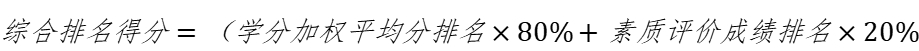 (三)需要在全院范围内进行排序的普通推免名额,以学生综合排名得分从低到高进行推荐,不再区分专业,综合排名得分相同时,按学分加权平均分从高到低排序。综合排名得分计算公式如下:
