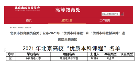 近日,北京市教育委员会发布关于公布2021年“优质本科课程”和“优质本科教材课件”遴选结果的通知,其中,我院周湘林副教授主讲的《政府组织与治理》专业课程获评北京高校“优质本科课程”。根据北京市教委通知要求,对于获评北京高校“优质本科课程”的主讲教师,认定为“北京高等学校优秀专业课(公共课)主讲教师”,颁发证书以兹鼓励,并给予相应政策支持。