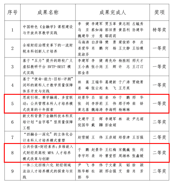 以上两项佳绩的获得充分体现了学院近年来在教育教学与人才培养改革方面取得的显著成果,是在教育教学方面取得的重大突破。一直以来,学院基于国家和学校对人才培养的要求,坚决落实立德树人根本任务,探索人才培养模式,优化人才培养方案,激励教师深入教育教学研究,提升教育教学理念,培养了学生创新精神、实践能力和社会责任感。接下来,学院将充分运用获奖成果,加强获奖成果的示范引领作用,继续深化教育教学改革,推动教学体系创新,不断提升一流公共管理人才培养质量。