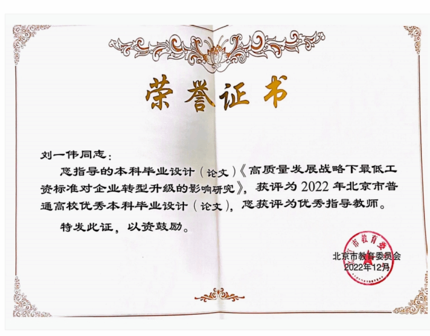 2022年11月3日,北京市教育委员会发布关于公布2022年北京市普通高等学校优秀本科生毕业设计(论文)名单的通知,我院刘一伟老师指导的本科毕业设计(论文)《高质量发展战略下最低工资标准对企业转型升级的影响研究》获评为2022年北京市普通高校优秀本科毕业设计(论文),刘一伟老师获评为优秀指导教师。