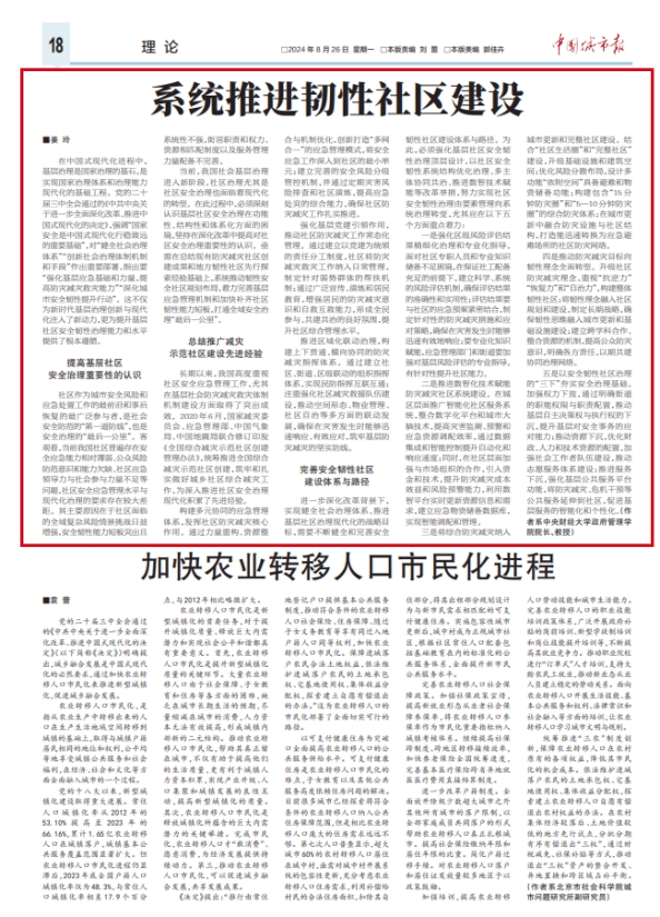 8月26日,《中国城市报》理论版刊登我院姜玲教授署名文章《系统推进韧性社区建设》。文章指出,在中国式现代化进程中,基层治理是国家治理的基石,是实现国家治理体系和治理能力现代化的基础工程。系统推进韧性社区建设需要提高基层社区安全治理重要性的认识、总结推广减灾示范社区建设先进经验、完善安全韧性社区建设体系与路径。