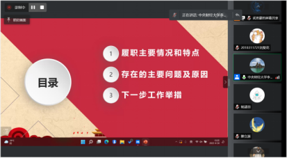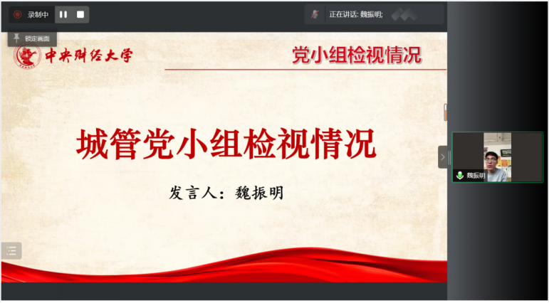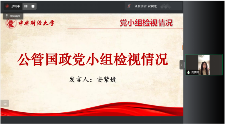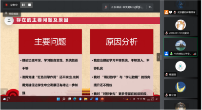 其次,周明迪、安紫婕、魏振明三位同学代表行管、公管国政、城管三个党小组依次汇报组内党员集中学习开展批评与自我批评情况。总体来看,三个党小组都结合学校文件精神,认真地开展了一对一谈心谈话、集中学习和批评与自我批评,效果较好,但仍存在着自我批评的角度单一且重复、部分党员反思不够深入不够彻底的问题。然后,许缤月、朱家和、李莎莉三位老师依次进行了工作汇报及自我批评。许缤月、朱家和老师都全面地从理论学习、工作、生活三个方面进行了自我检视,并在此基础上针对性提出了改进措施。李莎莉老师则结合工作述职与自我批评进行了汇报,工作述职从履职主要情况和特点、存在主要问题及原因、下一步工作举措三个方面展开。对照讲政治、能作为、重规范和乐奉献四方面标准,发现党支部建设在经典理论的系统深入性、规范化建设、群众工作和发展先锋模范作用上还有很长一段路要走。