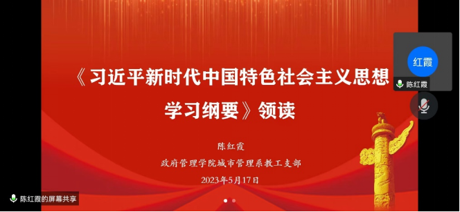 2023年5月18日中午,bv伟德国际1946城市管理系教工党支部书记陈红霞围绕深入学习贯彻习近平新时代中国特色社会主义思想,结合学习《习近平新时代中国特色社会主义思想学习纲要》,线上为全体党员讲授主题教育专题党课。