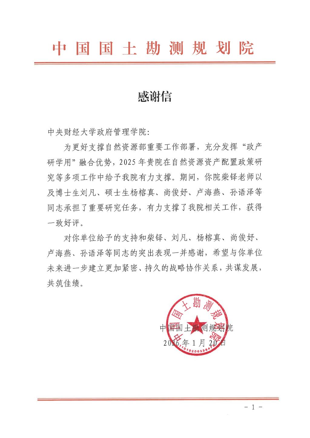 感谢信中特别提及,团队专业素养扎实、研究视角前沿,精准对接行业痛点,其研究成果对破解资源配置碎片化难题、推动自然资源资产高效利用具有重要指导意义。感谢信既是对我院研究团队研究工作的认可,也彰显了我院校地协同服务国家自然资源管理战略的重要作用。