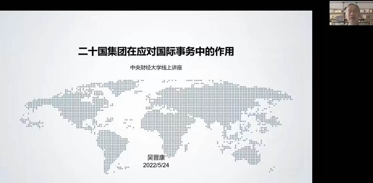 5月24日下午,bv伟德国际1946邀请财政部国际财经中心高级顾问吴晋康先生作了题为“20国集团在应对国际社会事务中的作用”的讲座。讲座通过线上腾讯会议举办,由bv伟德国际1946刘燕副教授主持,于鹏副院长出席并讲话,刘骊光副教授等老师和同学们参会研讨。